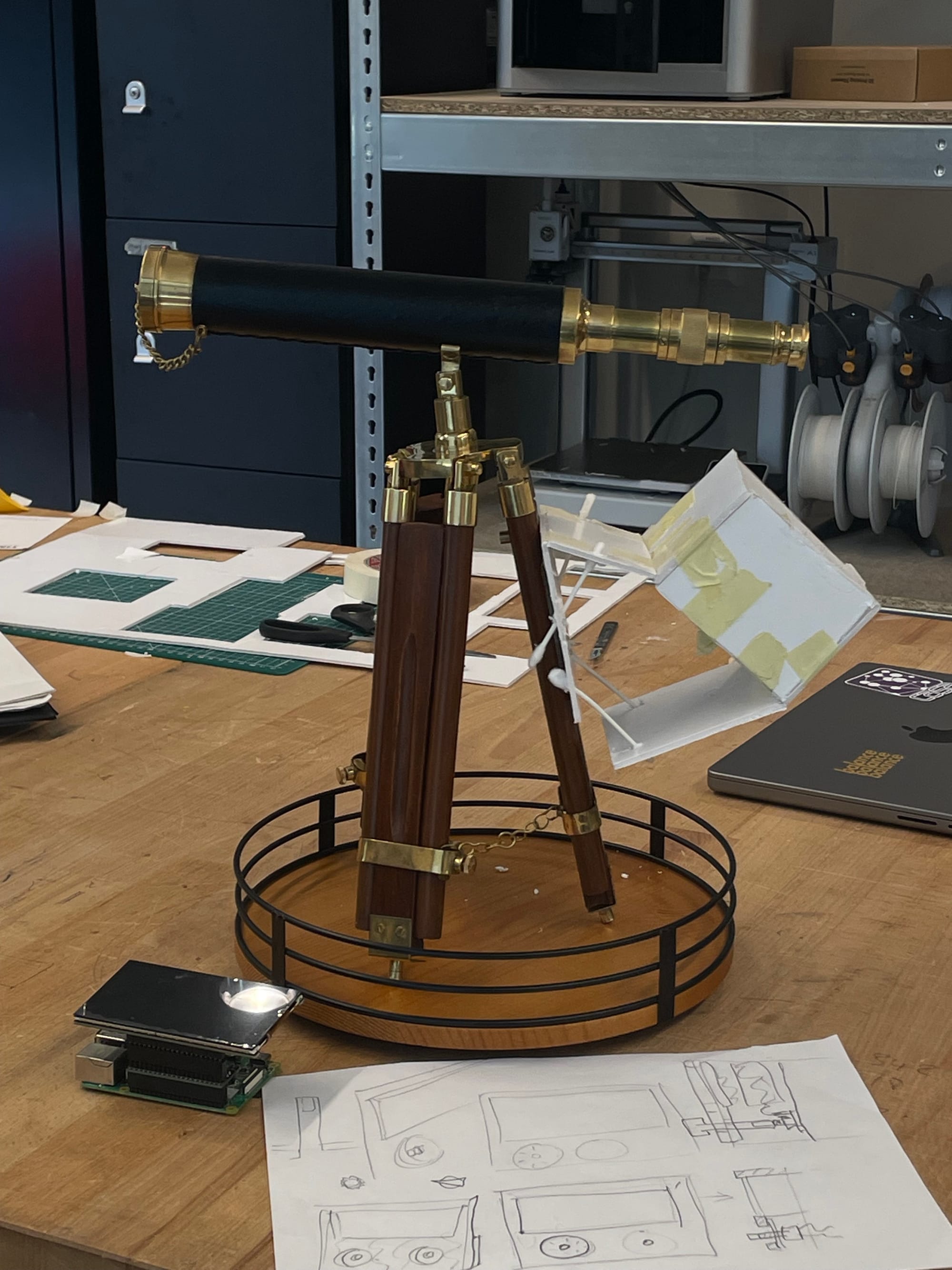 - 物理交互层(Physical Interaction Layer) —— 一台复古风格的望远镜,连接树莓派、编码器与触摸屏,用户可以通过旋钮选择“距离”和“时间”,并直接在屏幕上看到生成的画面;