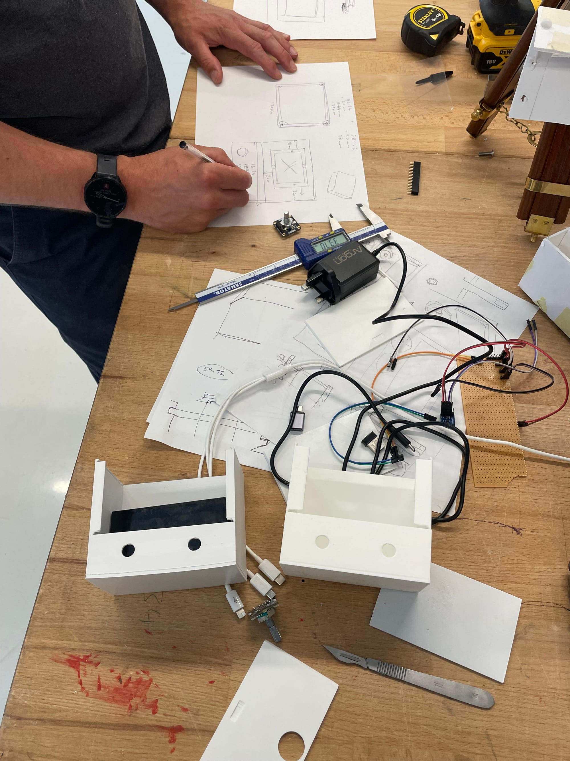 主箱体在 Fusion 360 中建模,Bamboo 打印机打印,外层包裹镭雕纸板与仿旧色涂装。