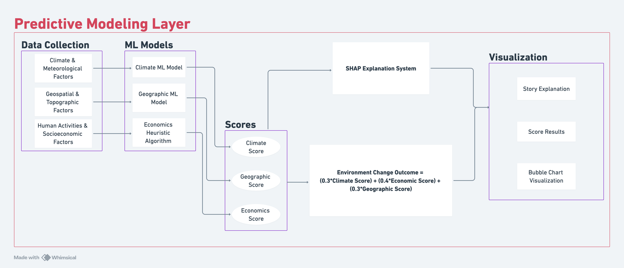 - 预测建模层(Predictive Modelling Layer) —— 基于机器学习模型(随机森林、LSTM等)对未来气候、地理与经济环境进行预测;