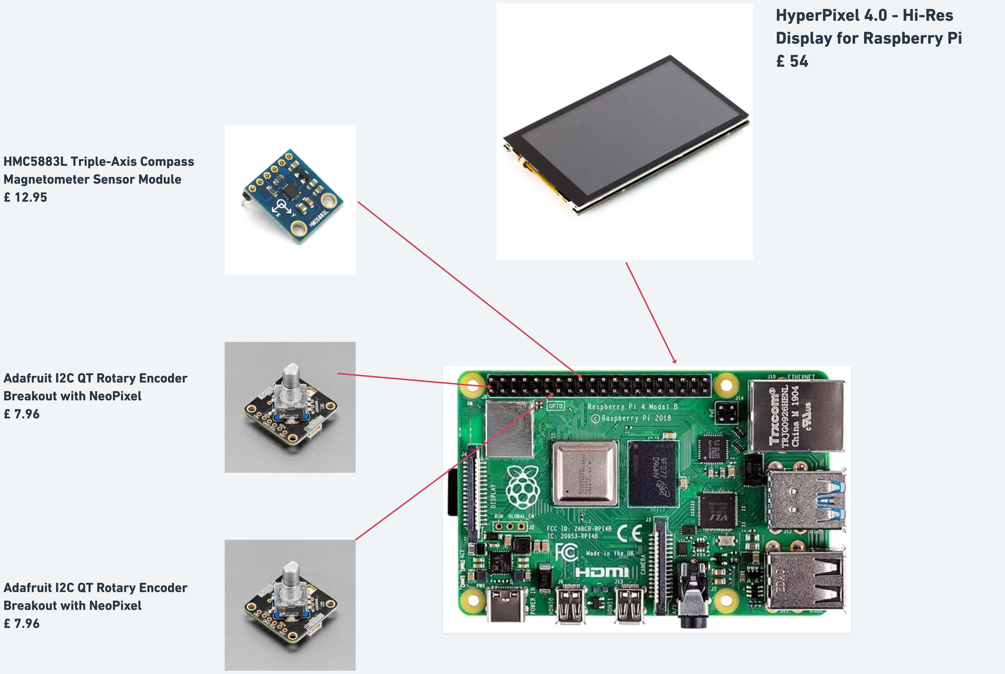整机的核心是一块 树莓派4B(4GB RAM),搭配 HyperPixel触摸屏 与两个 Adafruit旋钮编码器。
