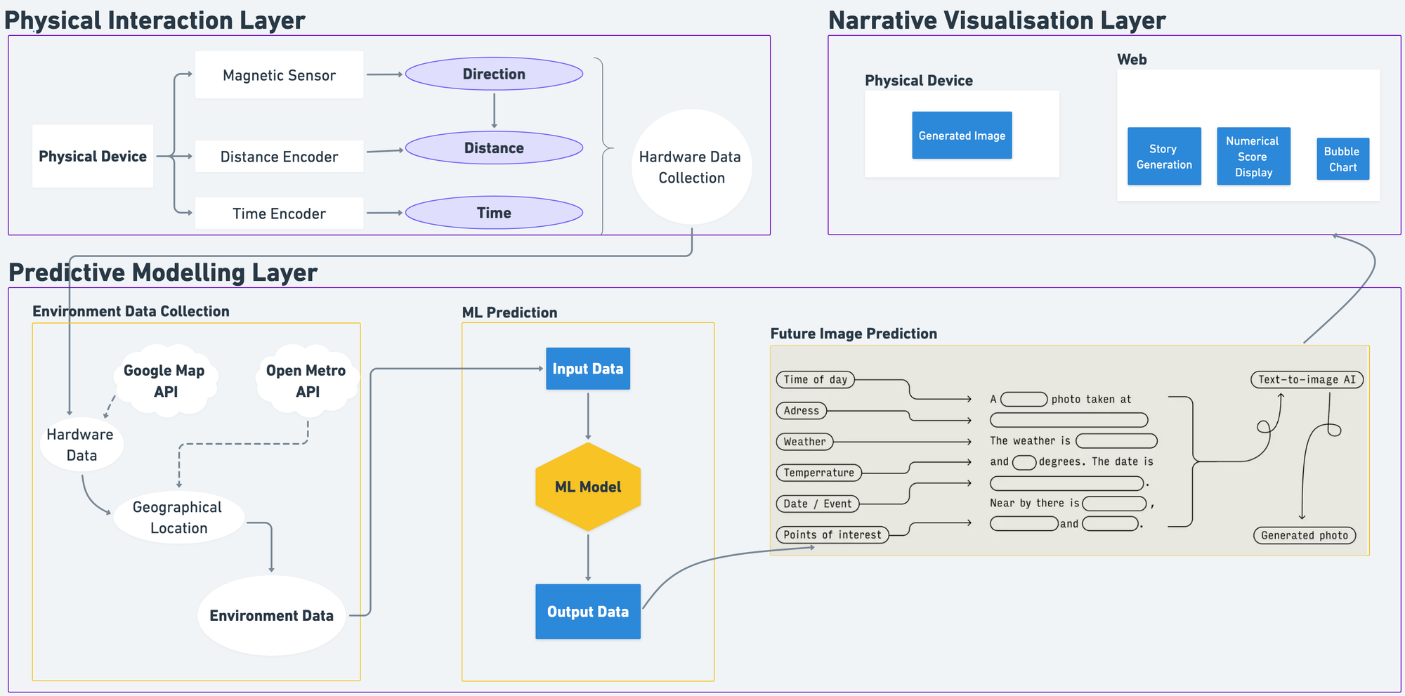 把系统从短期展陈移到学校、公共空间、社区等场域;让生成结果绑定在地数据与日常语境,弱化“展览新奇感”,强化与使用者生活的关联。 - 信息分层设计(从感性到理性)