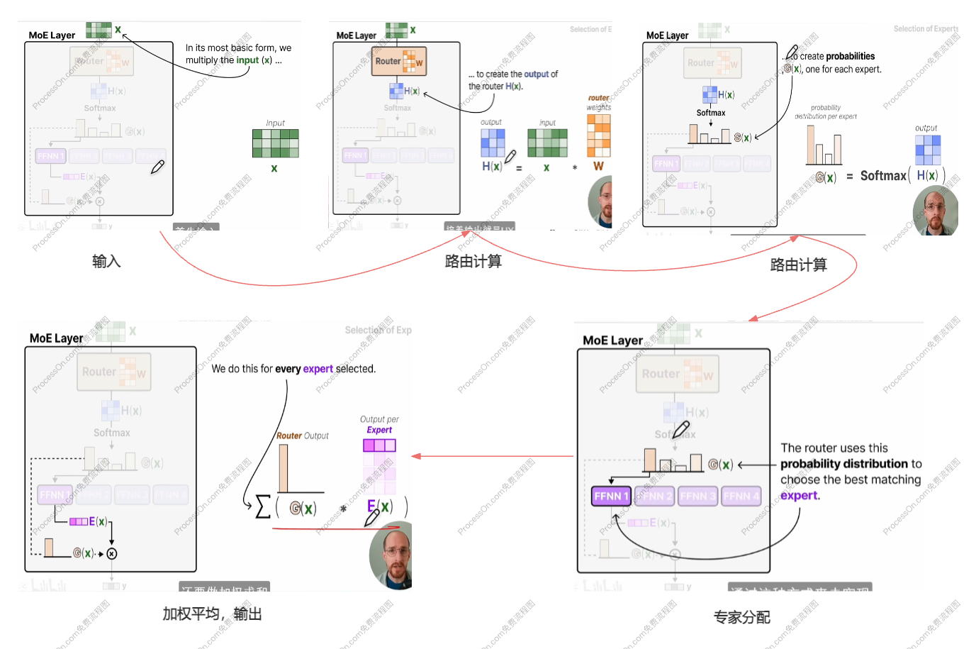 上面我们逐一过了MoE架构中的各个组成部分与重要设计,现在让我们整体的来梳理一遍 MoE 层的整个计算过程。