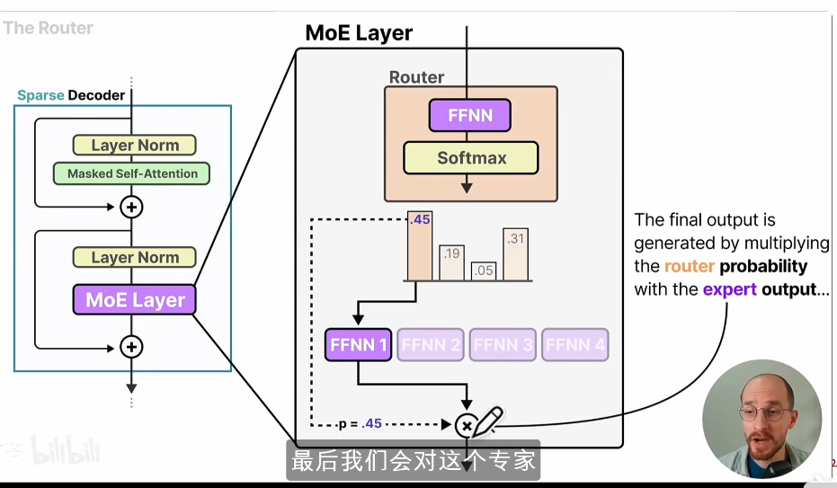 门控网络负责根据输入内容选择最合适的 expert,具体做法是对所有专家打分后,仅保留 Top-K(如前两个专家),其余得分设为负无穷,从而获得稀疏性。 -